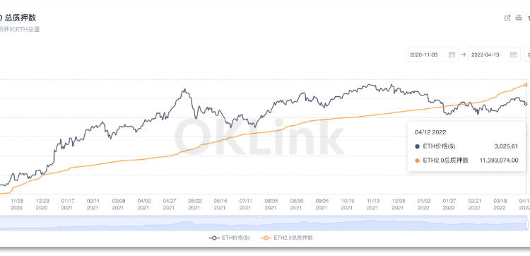 欧科云链数据显示,截至 4 月 12 日,ETH 2.0 的总质押数达到了 11393074 ETH,总质押地址数为 360938 个,总验证人(在信标链上充当实际验证者客户端的数量)为 355142 个。