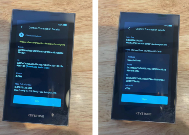 我们以转移一个 BAYC 为例具体来看 NFT 硬件钱包的使用。在 Keystone 中,用户可以使用 microSD 卡中上传的 ABI 数据文件快速确认地址的真实性,地址旁边会出现蓝色字体的「Board Ape Yacht club」,还需要确认该交易是否涉及任何恶意行为,以免将您的 NFT 签署给诈骗者或黑客。