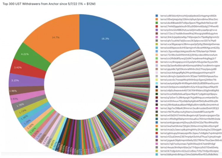 我们能得出一个结论,大规模的恐慌并没有蔓延,人们依然想把他们UST存在Anchor中。大部分用户在这次脱锚事件中并没有移动他们的资金,甚至都毫无察觉此次事件。小部分人产生了恐慌,并造成了价值100万美元以下的资金移动。而75%的资金转移量来自于恐慌人群的1%,他们占所有用户的0.1%。