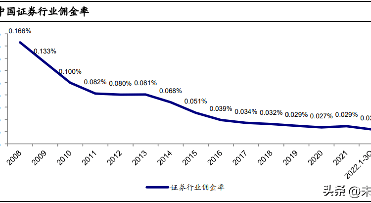 中国券商存在一定同质化现象,佣金战以来券商佣金率持续下行。由於中国券商业 务模式缺乏亮点,同质化较为严重,随着金融牌照放开、行业壁垒逐渐缩小、业内竞争 加剧等因素,券商利润率逐渐被挤压,这点在经纪业务佣金率上尤为明显。2014 年,国 金证券首推佣金宝,随後中山证券、国联证券等相继推出最低佣金率产品,自此券商行 业佣金战打响。随後 2015 年 4 月「一人一户」限制全面放开,行业佣金率下限不断被 打破,佣金率已从 2008 年 0.166%下滑至 2022 年三季度末的 0.023%。