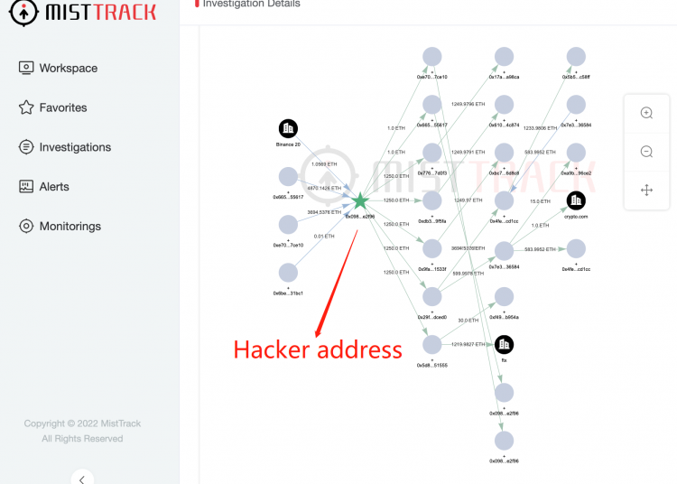 3 月 30 日,慢雾发文称,此次黑客攻击的资金来源于币安提币,且已将 2550 万枚 USDC 交易为 6250 枚以太坊,并进行了分散转移,其中 1221 ETH 转移到了 FTX 和 Crypto.com。