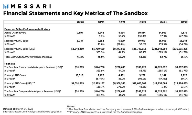 与此同时,相对于 2021 年第二季度,初级 LAND 销售增长了 23%。初级销售的对象是新发行的 LAND 地块,通常出售给合作伙伴或通过拍卖。尽管如此,2021 年第一季度,主要 LAND 销售额(1600 万美元)仅占市场 LAND 总销售额(1.36 亿美元)的 12%。